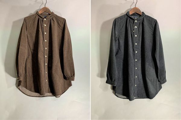 フロントタックシャツワンピースは、ビンテージガーメントを思わせる生地感のコットン素材。胸元のセンターに大きなタックを施し、アシンメトリーに配したフロントボタンで胸元をダブルにするライトコートのような感覚で着て頂けるワンピースです。