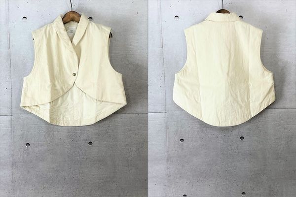ショールカラージレは、表面に独特なシボが立体的でシワになりにくくノーアイロンで着て頂けるオーガニックコットン素材。コットンの裏地も付いているので、しっかりとした生地感のベストです。大きな衿や前後差をつけた短い丈でコンパクトに着れるのでパンツでもワンピースでも合わせやすく、クラシカルな印象に・・・ サイズ:着丈F34.5cm、R55cm、バスト102㎝
