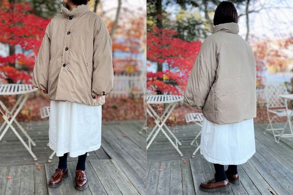 スタンドカラーオーバーダウンジャケットは、日本国内で加工された高品質のダウン(羽毛)で、保湿性、断熱性、弾力性に優れ、軽くてまるで寝具に包まれているような暖かさがある、ダウン90%フェザー10%の中綿にマイクロファイバーを高密に織られたしっとりとした肌触りのポリエステル素材。ドロップショルダーの膨らみのあるお袖や直線的なボリューム感で裾に向かって広がるAラインシルエットがゆるっとオシャレなオーバーサイズジャケットコートです。サイズ:(1)着丈約F73cm、R80cm、身幅約73cm