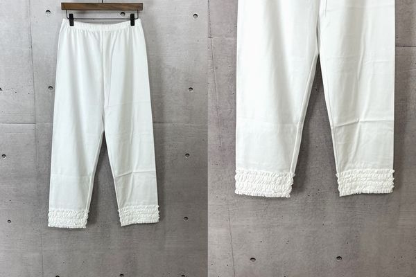 フリルレギンスパンツは、適度なハリ感で肌触りの良いコットン素材。レギンスの裾にコットン布帛のフリルを施してワンピースやスカートのレイヤードで足元に華やかさをプラス。暗めになりがちな秋冬コーデもモノトーンなモードな印象に・・・ サイズ:着丈95cm、ウエストゴム