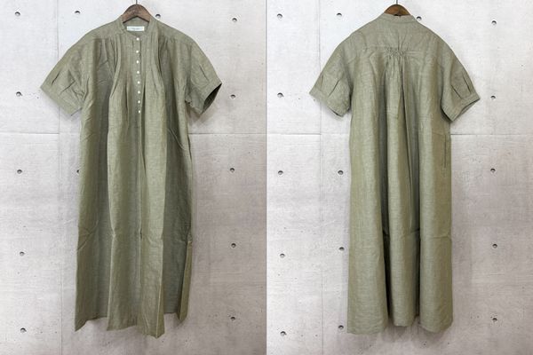 ダンガリーバンドカラータックギャザーワンピースは、色の異なる綿糸と麻糸で爽やかな色ムラと独特な風合いのダンガリー生地のコットンリネン素材。広い身幅に前身ごろのタックや背中のギャザーからAラインに広がるデザインがシンプルでスタイリッシュな雰囲気に・・・