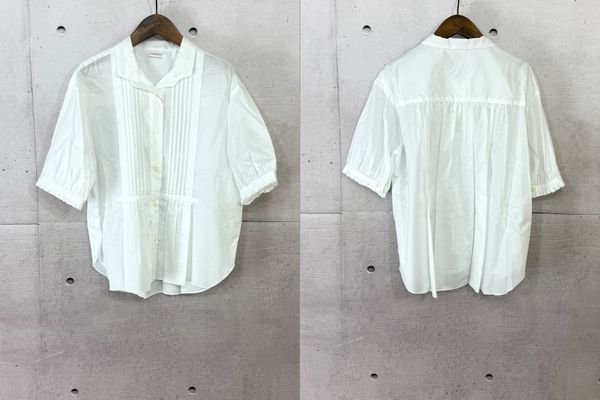 スムースウォッシュタイプライタークレリックシャツは、薄手でハリ感のあるタイプライターで織られたコットン素材。ワイドなボックスの身幅に細かなギャザーが施された爽やかなクリレックカラーのシャツブラウスです。サイズ:着丈63cm、身幅93cm